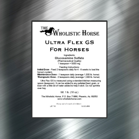 1 lb. of Ultra Flex GS For Horses contains "90" 5,000 mg. servings and will last the average maintenance horse three months for as little as 64¢ a day! Ultra Flex GS is non toxic, odorless, easily absorbed, and has no bitter aftertaste (unlike Glucosamine HCL which can have a bitter aftertaste). You simply add the powder to your horses pellets or grain and they won't even know it's in there. Now it's easy to keep your horse's joints healthy and pain free. This is a necessity for all aged and working horses for continued comfort and performance!